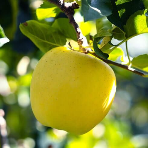 シナノゴールドは、「ゴールデンデリシャス」と「千秋(せんしゅう)」を親にもつ、平成11年に長野で生まれたオリジナル品種。ずっしりと重い黄金色の果実がたわわに実ります。このりんごの一番の魅力は、甘味の中に強い酸味がアクセントとなる濃厚な味。また、シャキッシャキの食感にじゅわっとあふれる果汁も魅力。大きなりんごなのに飽きずに食べることができます。貯蔵性が良いことも特徴で、シャキシャキ甘酸っぱくみずみずしい状態を保ちます。